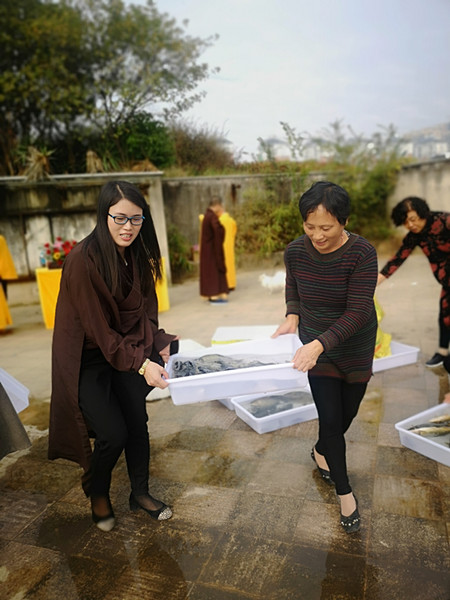 上午8时30分,法会开始。法师带领大家唱诵放生仪轨,发大弘愿,广行忏悔,并为众生灵洒净、做三皈依。法会结束后,放生一众生灵。